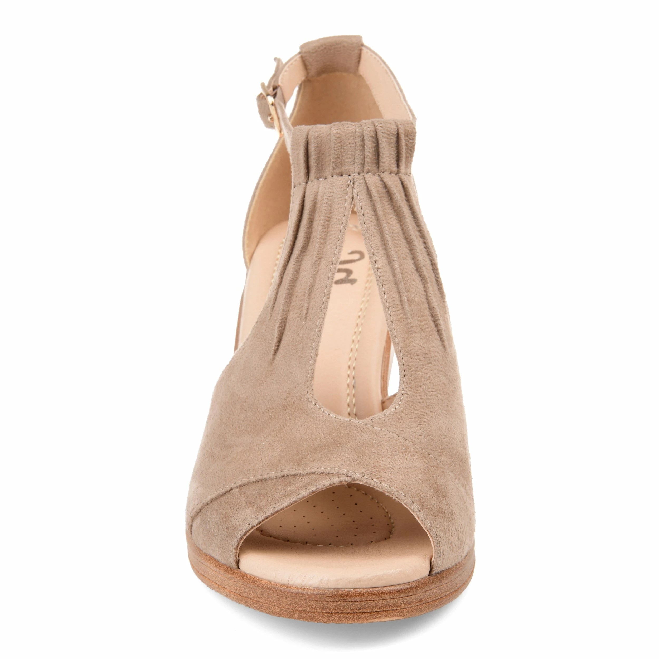 Ruched details and a peep-toe add a charming note to this wedge heel. Soft vegan suede uppers supported by a 4 mm Tru Comfort Foamâ„¢ insole finish this wide-width design for the perfect fit.