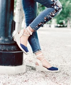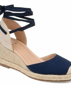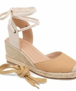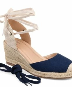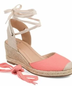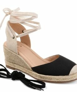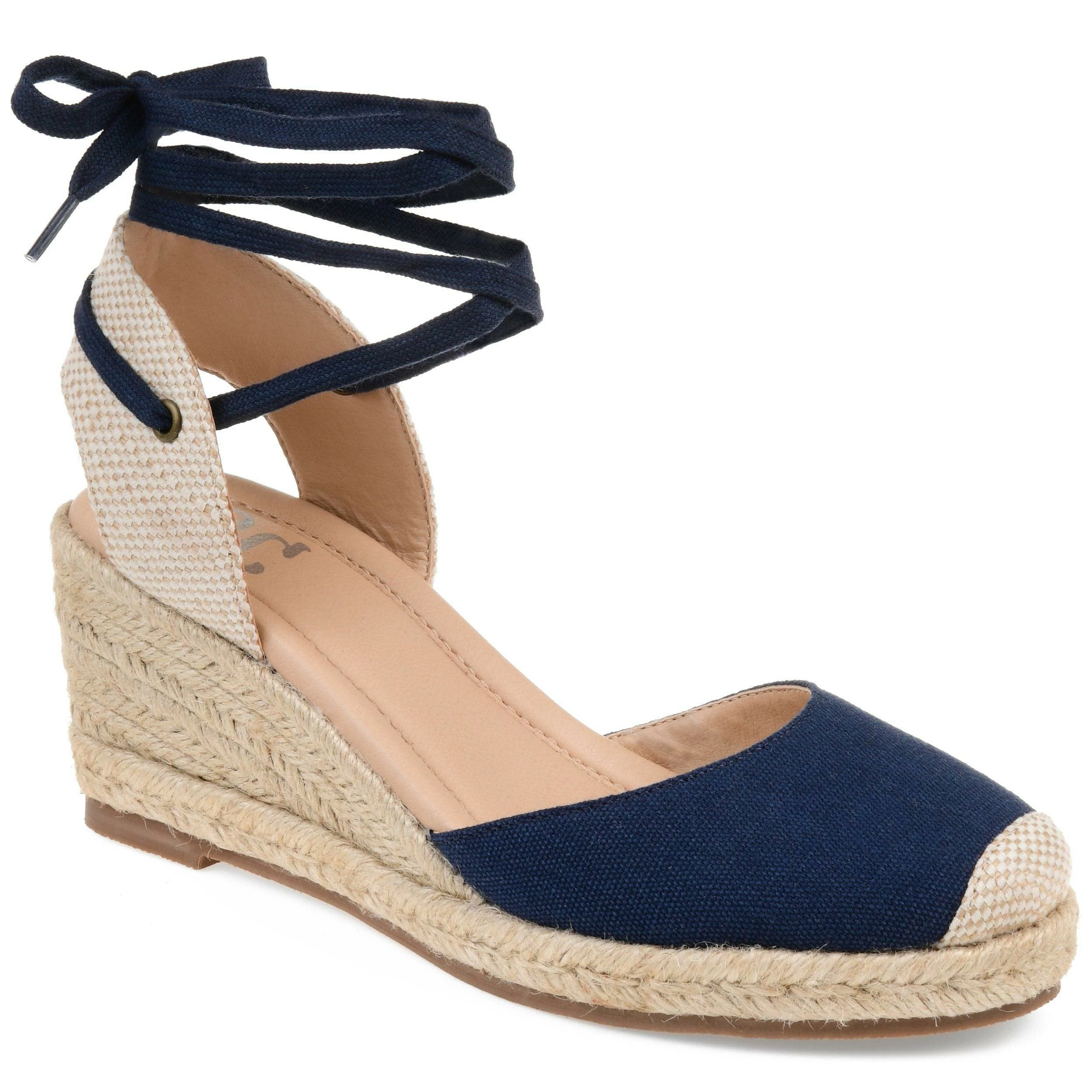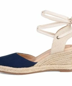 A wedge heel covered in braided espadrille elevates this round-toe silhouette thoughtfully shaped with light canvas fabric. This charming warm-weather look features an open back fastened with interchangeable wrap-around ankle ties that can be styled to your liking and a 4 mm Tru Comfort Foam™ footbed for all-day wear.