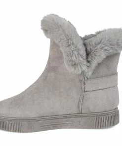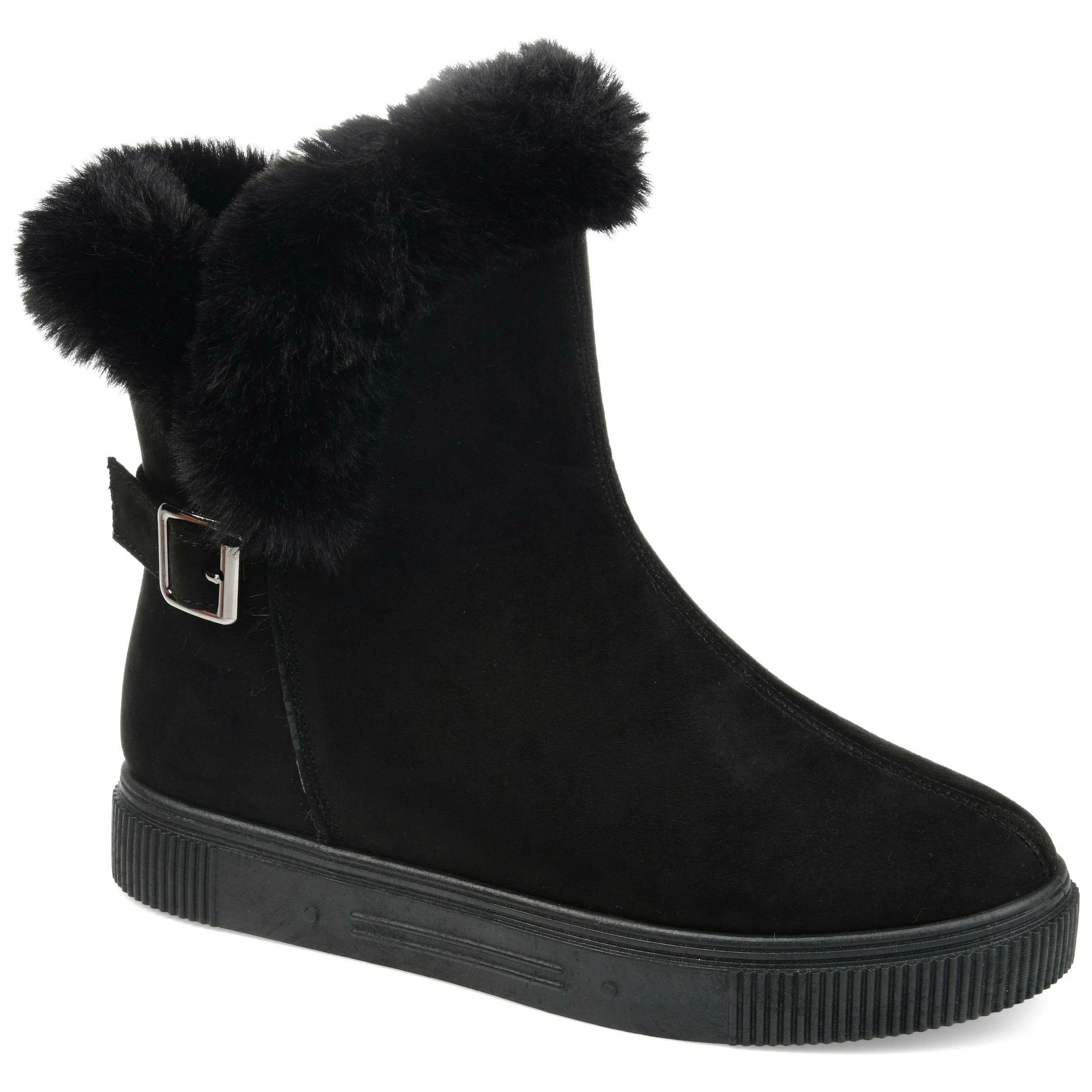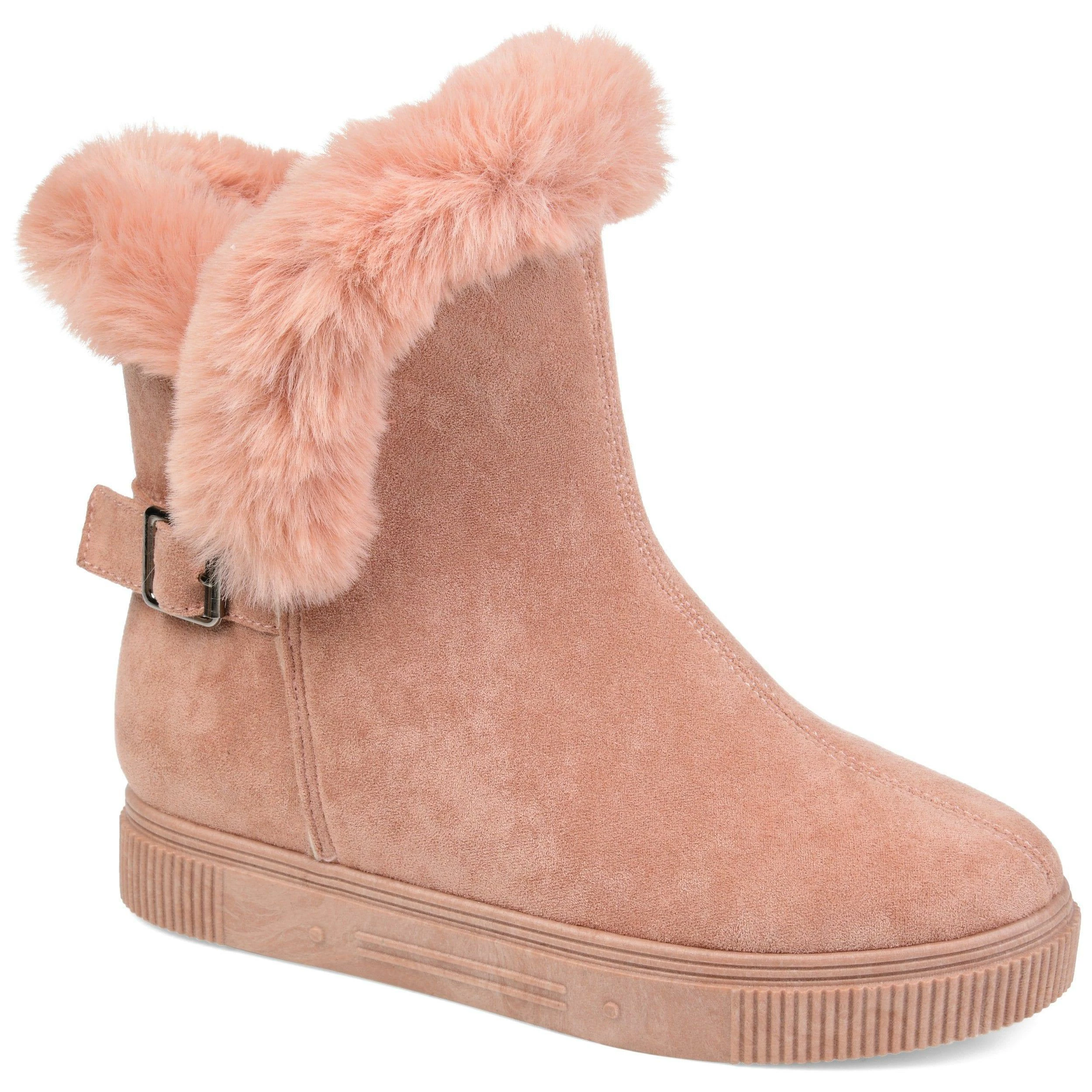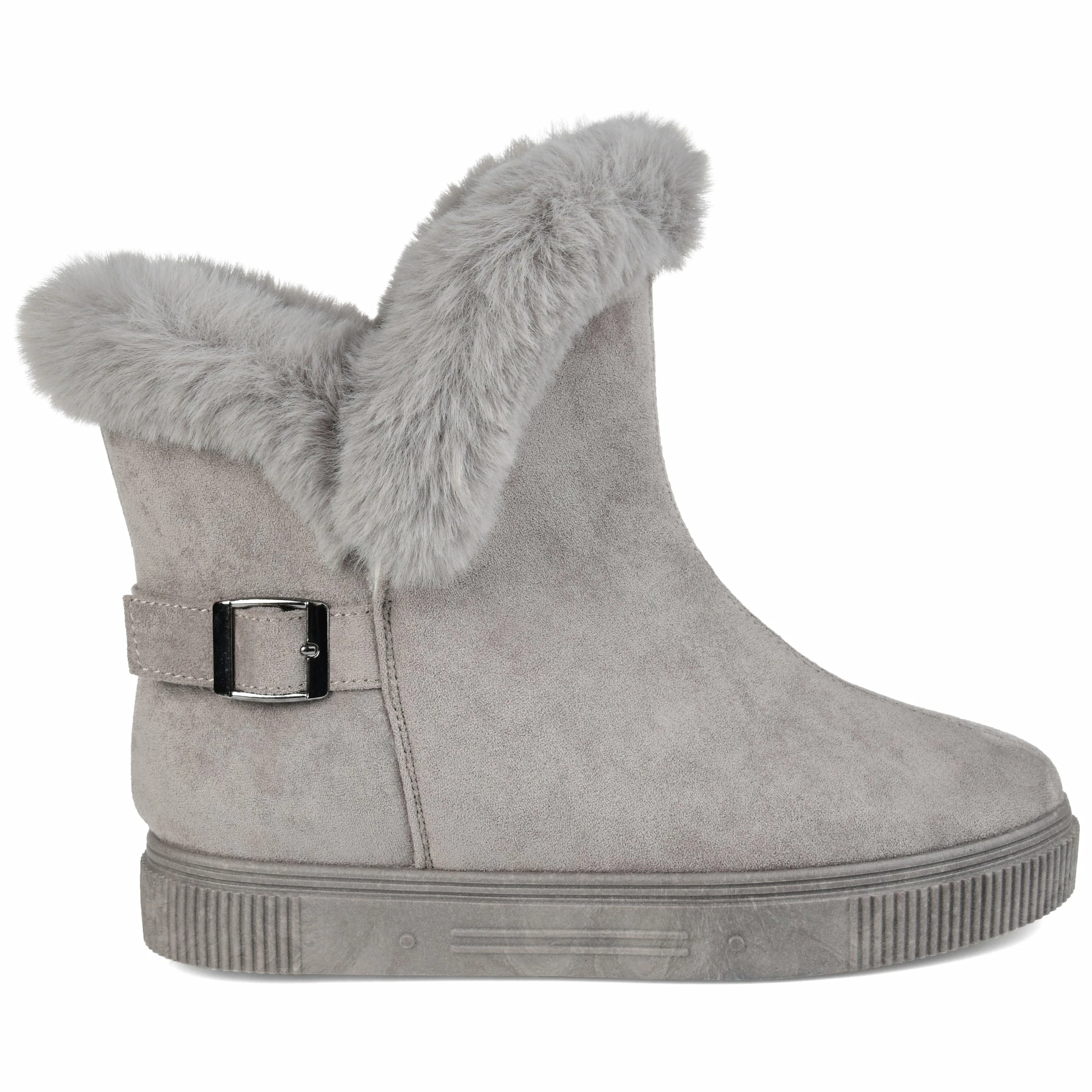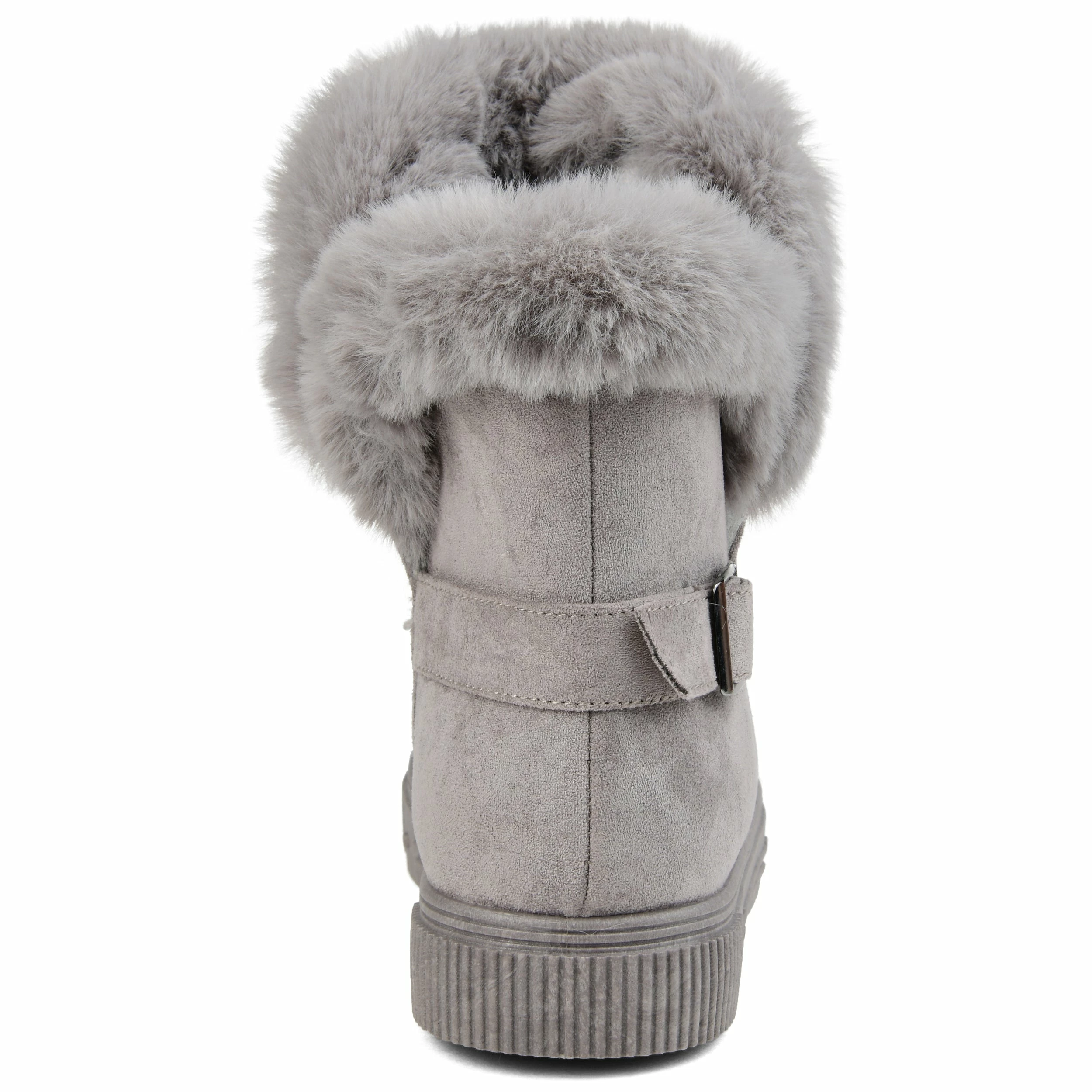 Slip-on an oh-so-comfy faux fur-lined casual boot rendered with velvety vegan suede detailed with a round-toe, a buckled strap, and a thick rubber sole made for icy cold days.