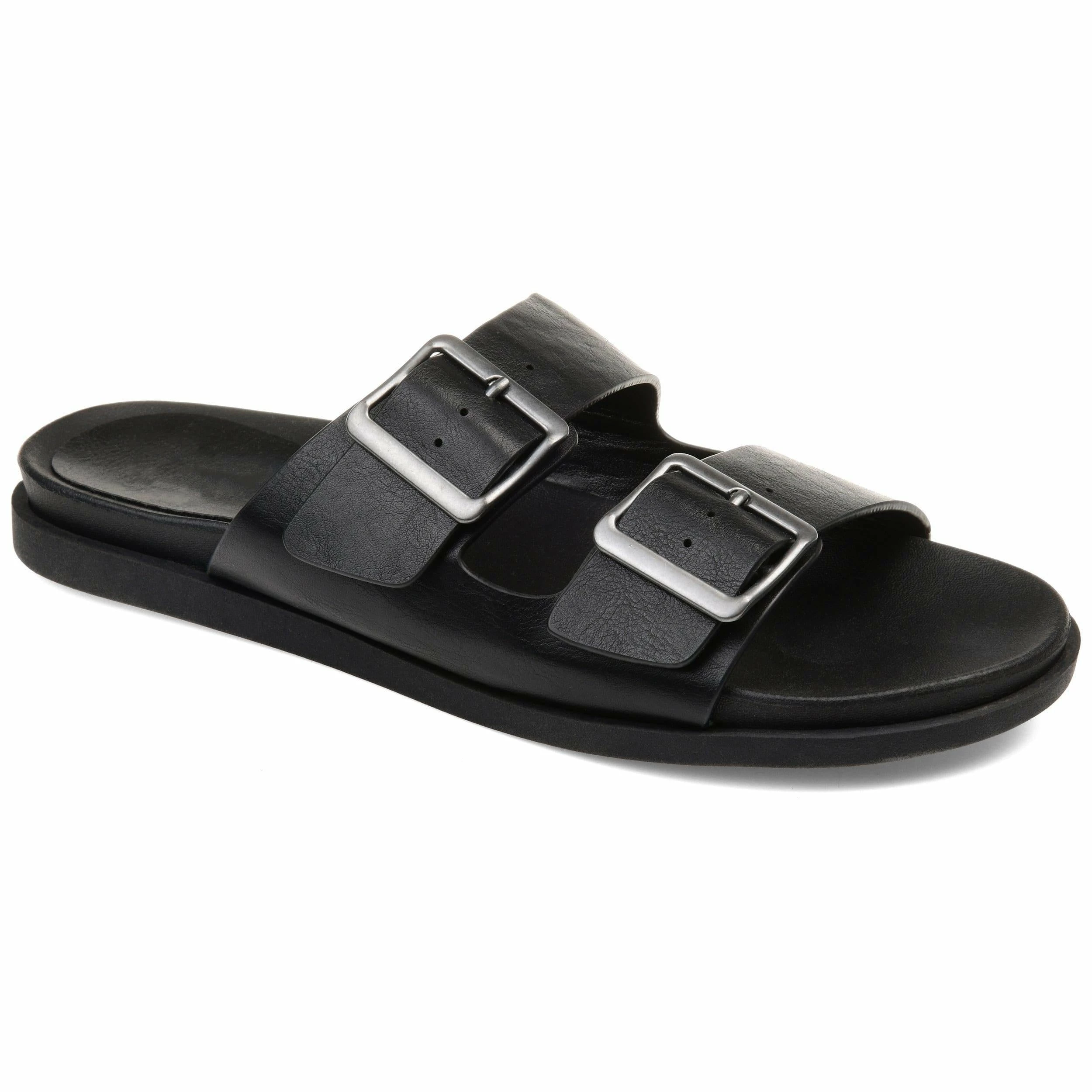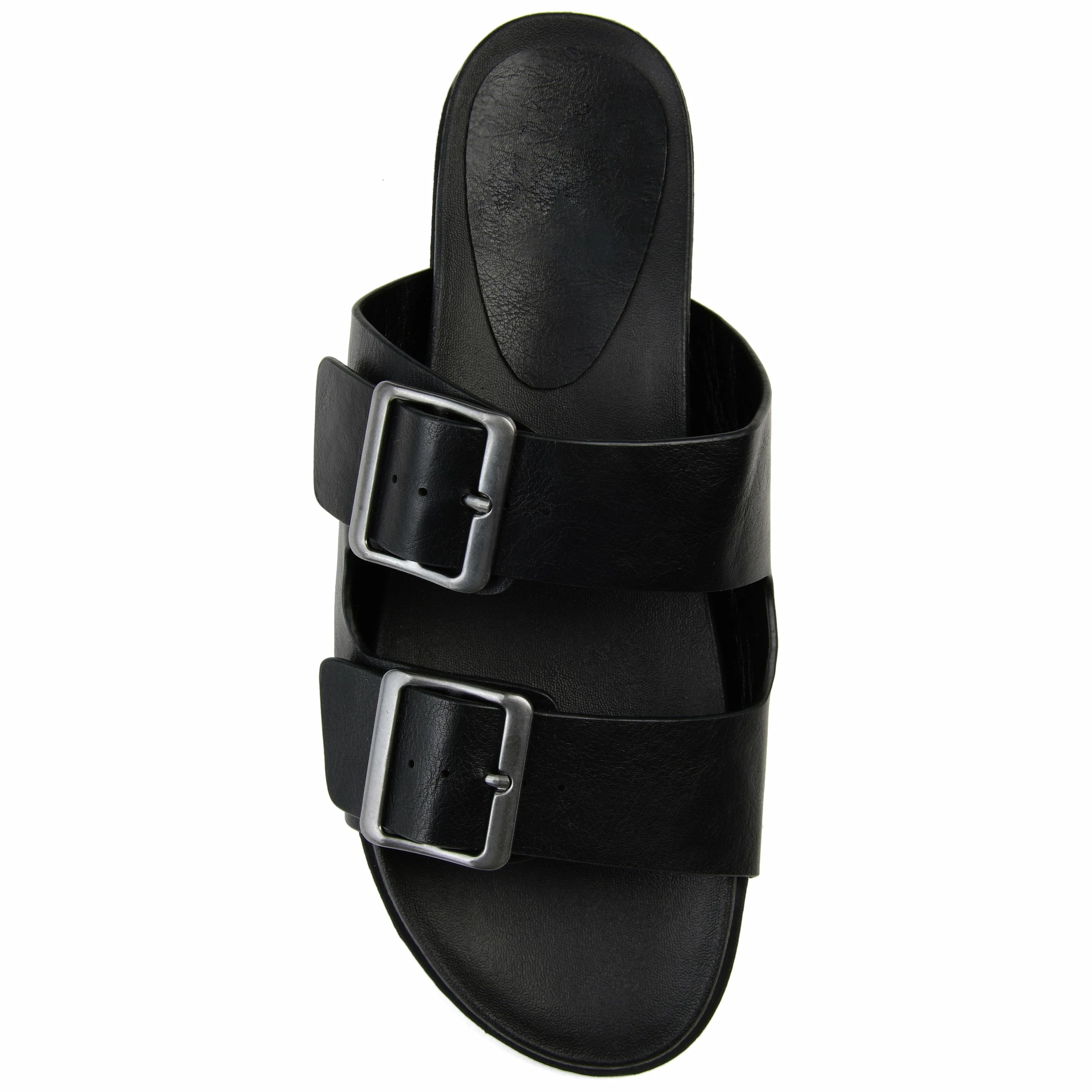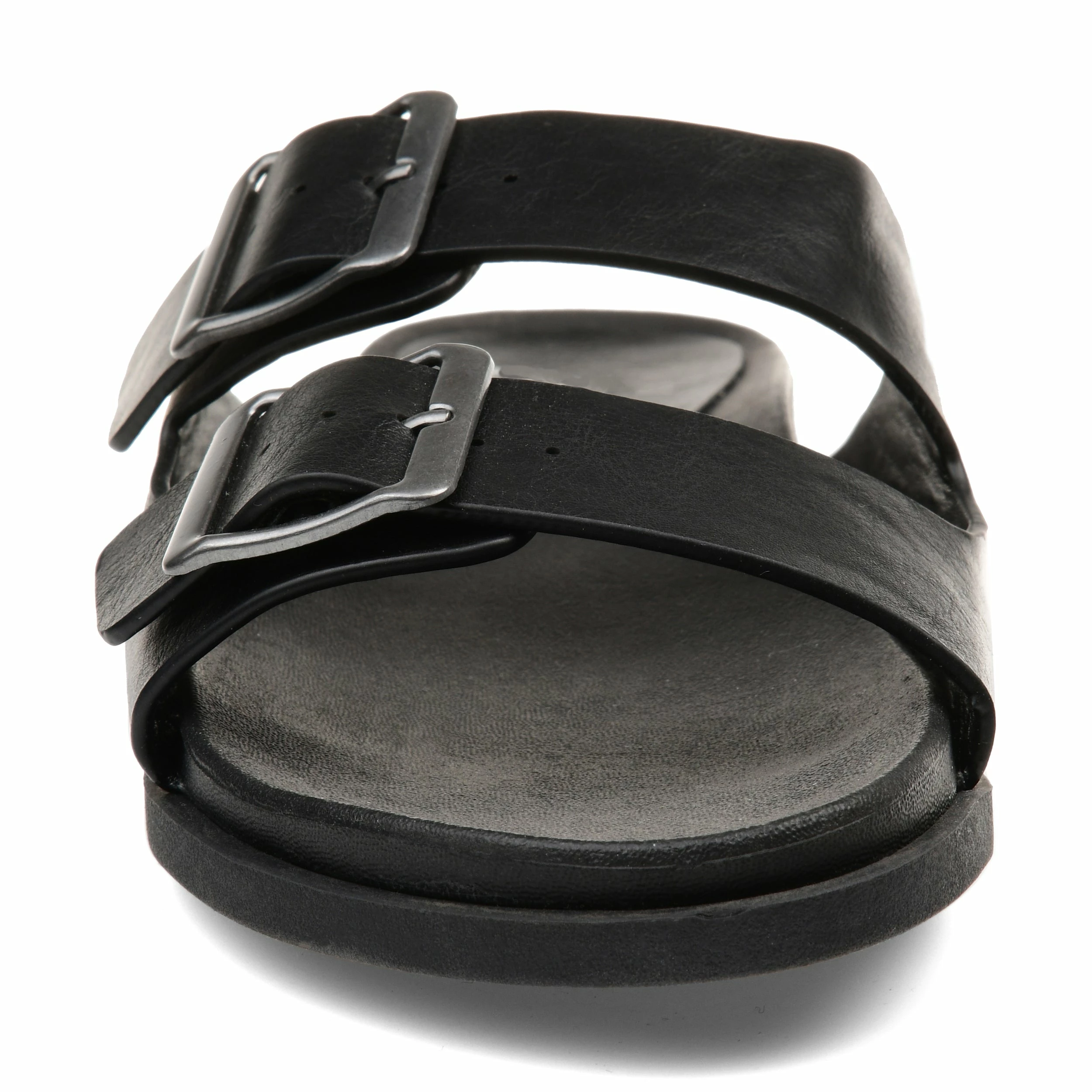 Bold square buckles top this throwback style. This cool, comfy, chunky slide is made with vegan leather uppers shaped into a thick dual toe strap resting on a flexible yet durable rubber sole for a perfectly effortless look.